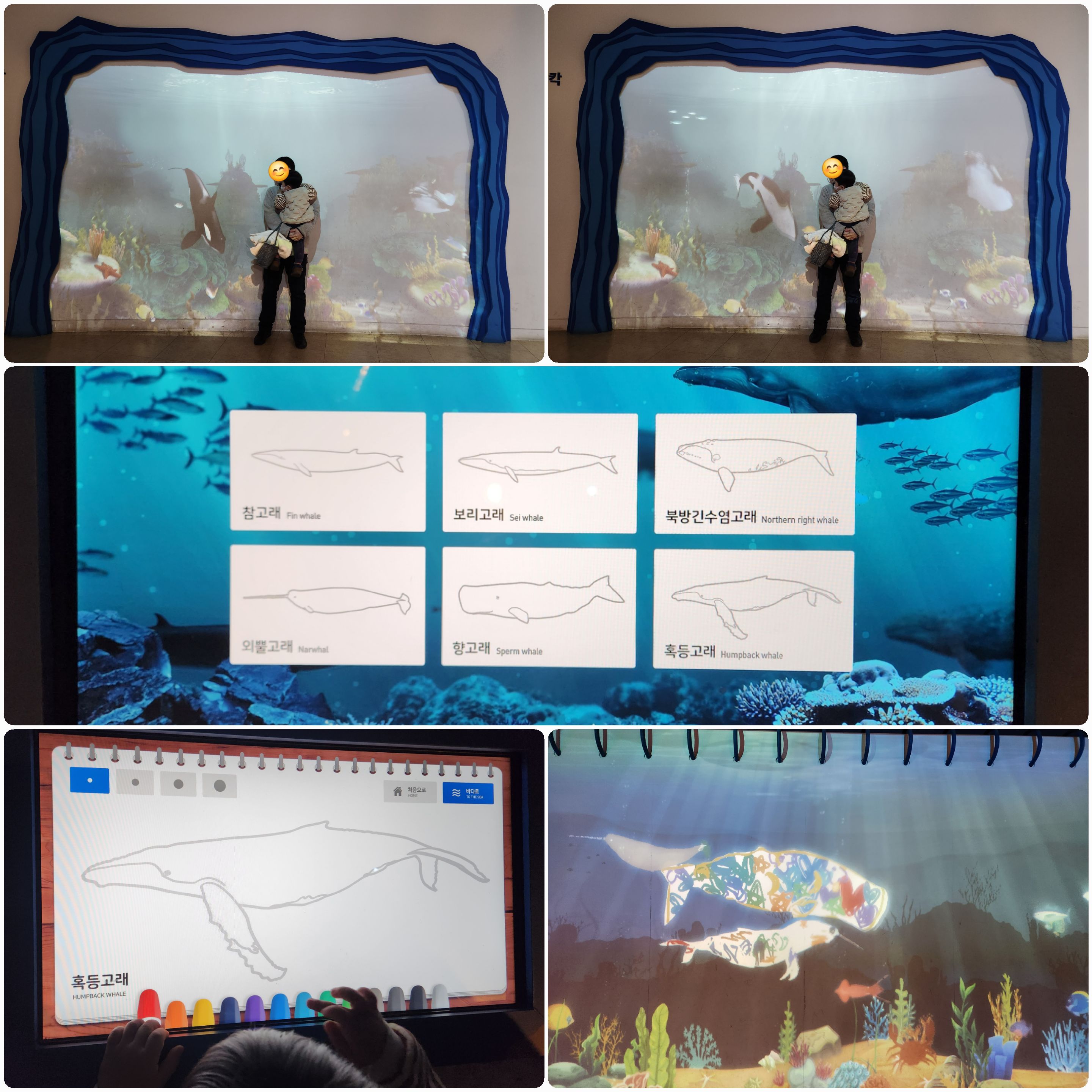 색칠하고 싶은 고래를 골라 색칠해 보고 바다로 보내기를 누르면 앞에 있는 대형스크린에서 고래가 헤엄쳐 다닌다. 생각보다 줄이 없어서 금방 체험할 수 있었다.