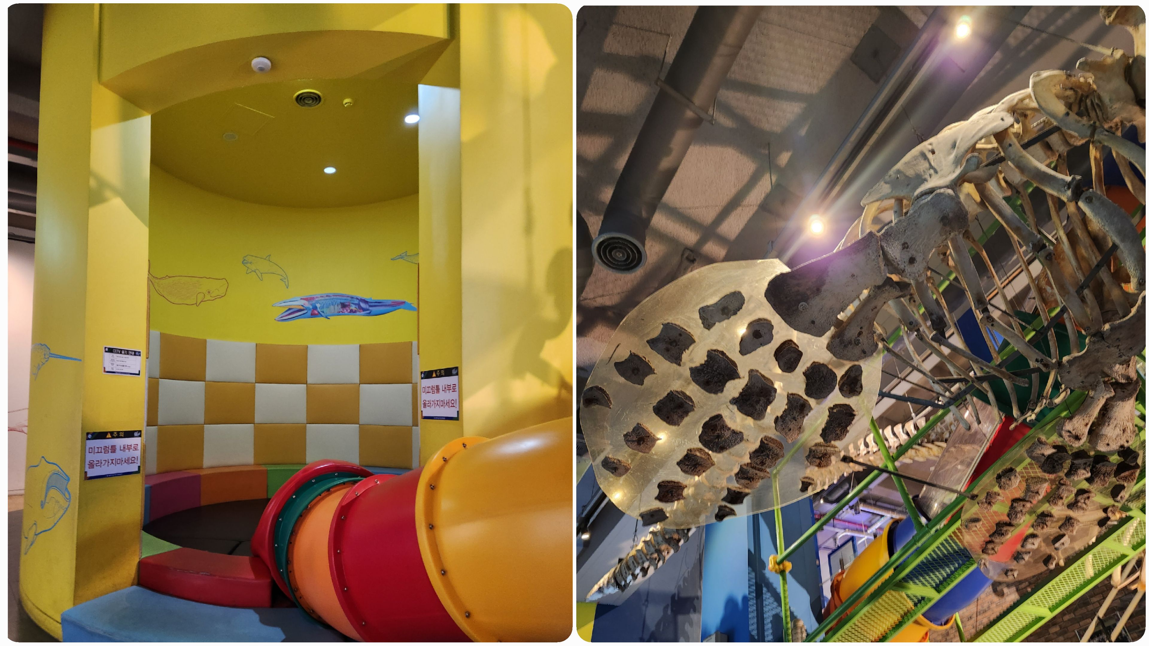 2층에는 3층에서 미끄럼틀을 타고 내려오면 안전하게 도착할 수 있도록 되어있다. 그리고 큰 고래뼈가 전시되어 있는데 고래 지느러미 뼈가 신기해서 찍어보았다.